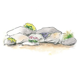Rozpoczynamy od niskich części stoku i pracujemy w górę, starannie ustawiając każdy kawałek mniej więcej tak, jak był umiejscowiony w naturze, najbardziej atrakcyjną stroną do wierzchu, ale też najszerszą stroną w ziemi. Głazy muszą stać stabilnie, nie można odnosić wrażenia, że za chwilę się przewrócą. Dlatego wygodne są płaskie kamienie, które najłatwiej układać, tworząc miniaturowe klify.