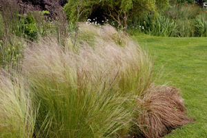 - Ostnice (Stipa tenuissima) — lekkie, pierzaste kępy, idealna na słoneczne miejsca; dodaje powietrzności.