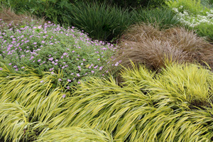 - Hakonechloa macra — japońska trawa leśna, kopułowaty kształt, efektowny pomarańczowo-złoty jesienny kolor; świetna do donic i cienistych rabat.