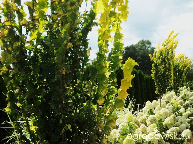 Nie miałam miejsca wewnątrz na duże drzewo, ale do myślenia dała mi opinia Pszczółki, że przydałaby się jakaś przeciwwaga dla brzóz rosnących na drugim końcu działki. Przy bramie garażowej na zapłociu wsadziłam ambrowca. Jeśli masz na niego miejsce, to warto go mieć. Bardzo długo trzyma liście. Klonom opadają pomalutku, a jemu nie.