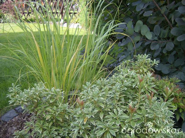 Nic nie widać więc piszę, po kolei od lewej: 2 miskanty ML, 4 hortensje Lime Light, Wiąz Aurea, a w nogach 5 sztuk Imperaty cylindrycznej Red Baron, Miskant Zebrinus, znowu 3 Limki (na zdjęciu widać już tylko jedną), dalej 3 derenie Sibirica (patrząc z tarasu za brzozami) i 3 pęcherznice Luteus dla rozjaśnienia ciemnego kąta.