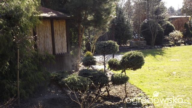 Ta rabata: chciałam ją wysypać otoczakami w naturalnych kolorach, takich plażowych. Śliwę przesadziłabym 2m w lewo. Pod nią hortensje. żółte i zielone plamy to albo żurawki, albo hosty, albo iglaki płożące, bo zimozielone - co lepiej? Gdzieś pomiędzy żurawkami - rododendrony. Z tyłu trawy wyższe, gdzieś po środku nieco niższe, zielone i żółtawe. Tuż przy płocie rosną już duże krzaki borówki amerykańskiej, której nie chciałabym przesadzać. Wierzba hakuro - wg. dekalogu Danusi nie będę się zastanawiać tylko posadzę, bo inaczej nigdy się nie zdecyduję - najwyżej później wyrwę). Pod hakuro berberys albo bordowa żurawka jako nawiązanie do purpurowej śliwy. Te dwa trójkąty po prawej to albo świerki serbskie, albo pospolite, przycinane by nie rosły za wysoko (tylko do ok. 4m). Przyznaję że bardziej podoba mi się kolor świerków pospolitych, ale nie wiem które będą lepiej rosły.
