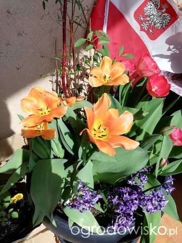 Aniu masz mnóstwo szafirkow ładnie wyglądają z tulipanami. Na fotce co to za roślina ta różowa za szafirkami. Tulipany w tym roku wyjątkowo długo kwitną bo chlody były,