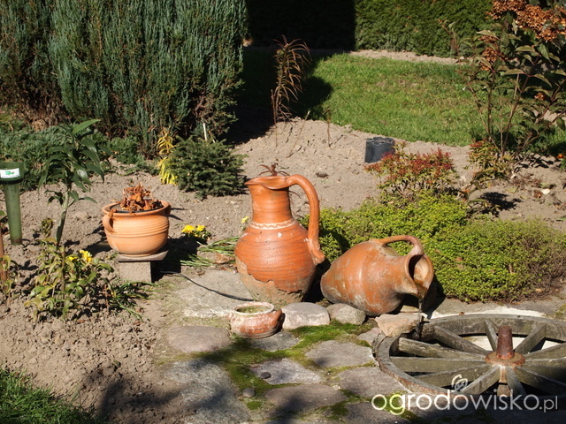 Przy świerku conica 3 kulki bukszpanowe, dalej krzak hortensji nie wiem jakiej, kwitnie na różowo, ale ma mało kwiatów... do przesadzenia...