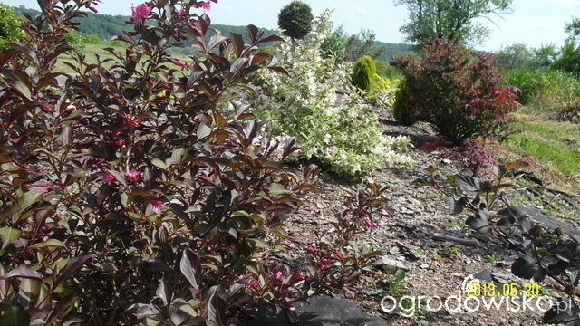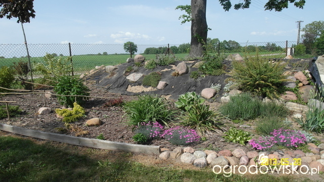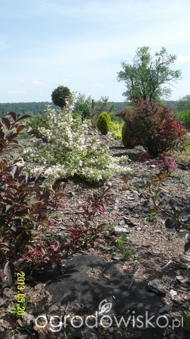 Wraz z meżem chcieliśmy ją jeszcze dodatkwo jakoś ,,przyozdobić,,., zwłaszcza że jest to frontowa część działki, więc każdy przejeżdzający i odwiedzający nas witany jest taką oto rabatą. 3 lata temu wyczyściliśmy cały teren wokół piwniczki, nawieźliśmy nową glebe, rozłożyliśmy agrowłókninę i nasadziliśmy krzewy. W miarę czasy część krzewów została przesadzona w inne miejscu, a puste miejsca zasiedłiły kocimiętka ( zwana przez moją teściową ,,kocipiętką,,