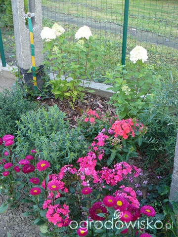od poidełka aż do gruszy jest różanka, a na niej posadzone jeszcze są liliowce, bodziszki i z tylu powojniki jako tło, a za powojnikami piwonie zanim urosną powojniki one przekwitną