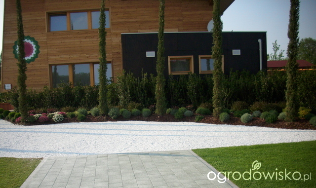 Otrzymałam moje kule! Mimo że zamówiłam jedną w prawie największym z dostępnych rozmiarów, nie wygląda imponująco na rabaciePostanowiłam jednak zostawić te kulki i ich nie odsłyłać. Tak wyglądają w rogu tarasu pod dużym świerkiem Hoopsii (niestety pada deszcz i zdjęcia robiłam na szybko):
