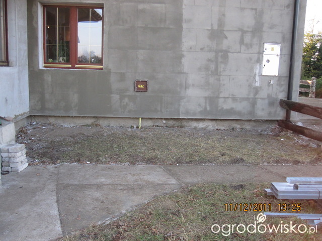 Kostka brukowa służy tylko do oznaczenia granicy, ale niedługo zniknie. Za stanowiskiem widac buki. To też dzisiejszy sukces. Taki mały żywopłot bukowy stoi wzdłuż kawałka granicy z sąsiadami. Jednak w tym miejscu stanie nowa komórka na narzędzia i ten żywopłot będzie widoczny już tylko od strony sąsiadów. Więc wykopaliśmy 3 sztuki i przenieśliśmy na tyły rododendronów. Będą dla nich chyba niezłym tłem, a poza tym zakryją kompostownik, który tam własnie stanie. Mam nadzieję , że się przyjmą w nowym miejscu.