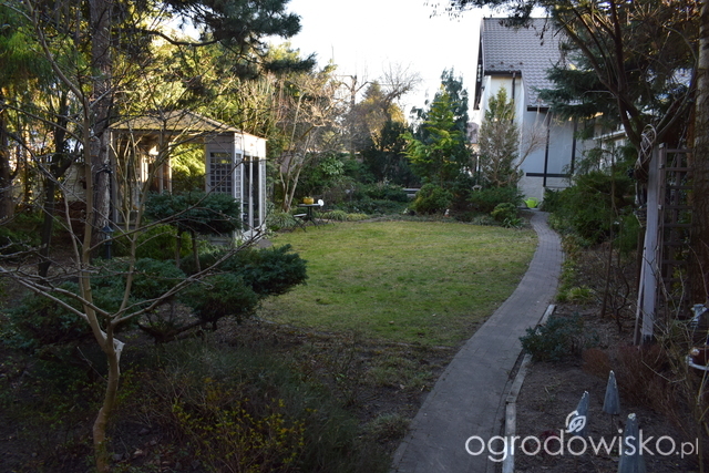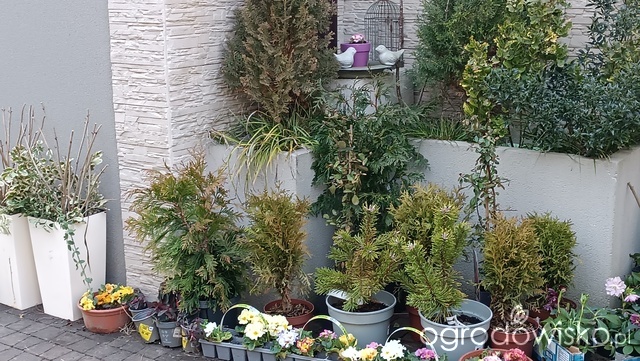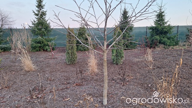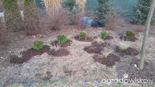 Kupiłam sobie też dwie tuje DeGroot's Spire. Są za ambrowcem, a przed dereniami Siberian Pearls.