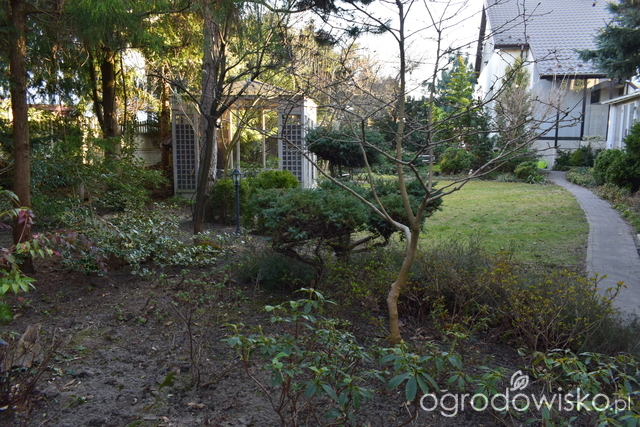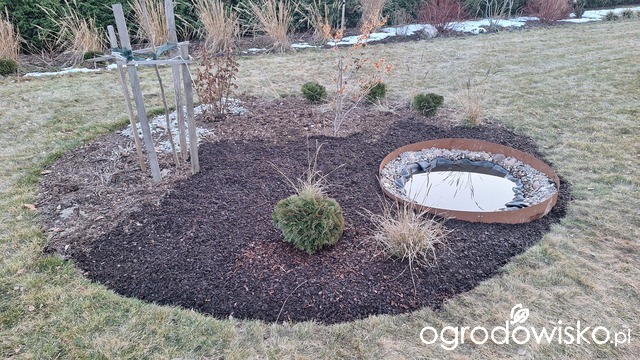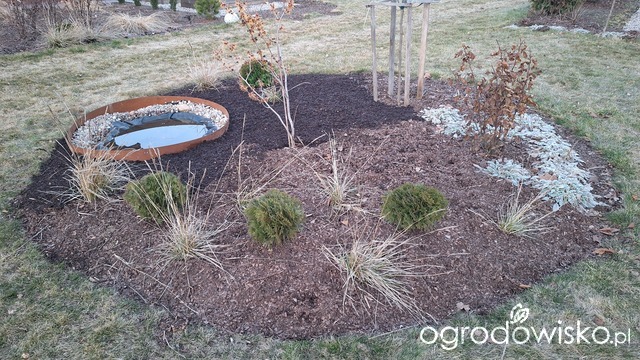 Prawie na ukończeniu mam rabatę platanową. Oczko niestety nie wyszło tak, jak chciałam, bo gruba folia jest bardzo trudna do ułożenia i wystaje spod kamyków. Będę poprawiać, ale w przyszłym sezonie, bo na razie mam sporo innych prac. W oczku przezimowały miniaturowe lilie wodne.