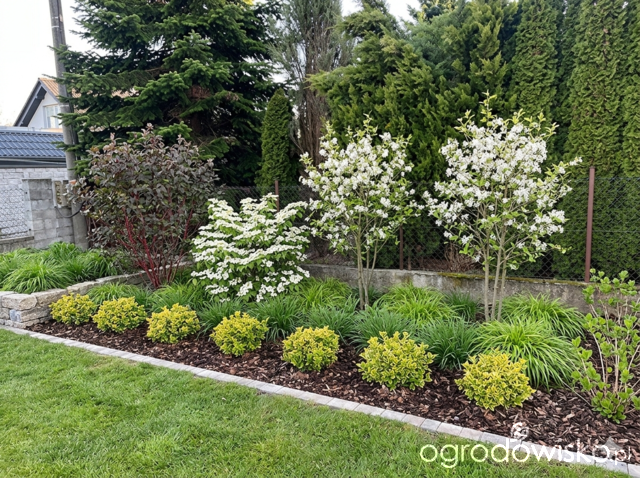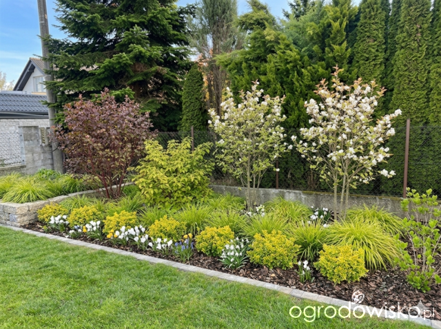 Sezon otworzyłam posprzątaniem rabaty wzdłuż ogrodzenia, na jesieni została poszerzona i nowy pas obsadzony a teraz ładnie wszystko przykryłam korą. W prawdzie już widziałam jakieś chwasty, ale nie czas był na plewienie i liczę, że znajdę go kiedyś tam w sezonie na ich wyplewienie.