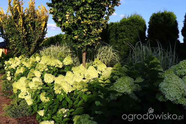 Wierzba rośnie w dużej donicy, razem z 2 trawami i 2 thujami. Zdjęcia są robione od strony zachodniej, czyli po lewej stronie fotografa jest północ, po prawej - południe, tam gdzie ogrodzenie - wschód.