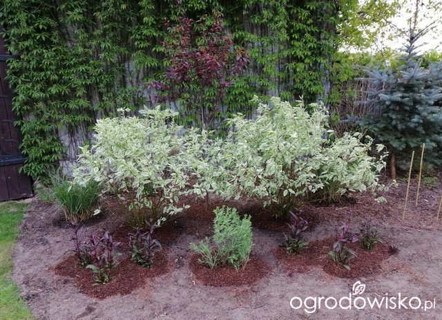 3. A w tle wiśni Kanzan (prawa strona) grupy krzewów w formie żywopłotu nieformowanego. Tu jest najwięcej miejsca na nie. Gdzieś pomiędzy przemycone powinny być trawy. Tak samo tu bym widział trawę pampasową jako mocny akcent.