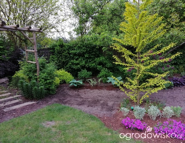 Klon garnet (będzie wykopywany) i judaszowiec Forest Pansy (zostaje)