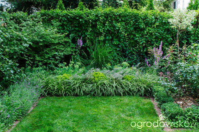 Pod pergolą powojnik Rouguchi, przed nim 2 róże Charles Austin, werbena, kłosowiec i miskant i wszystko podsadzone kocimiętką.