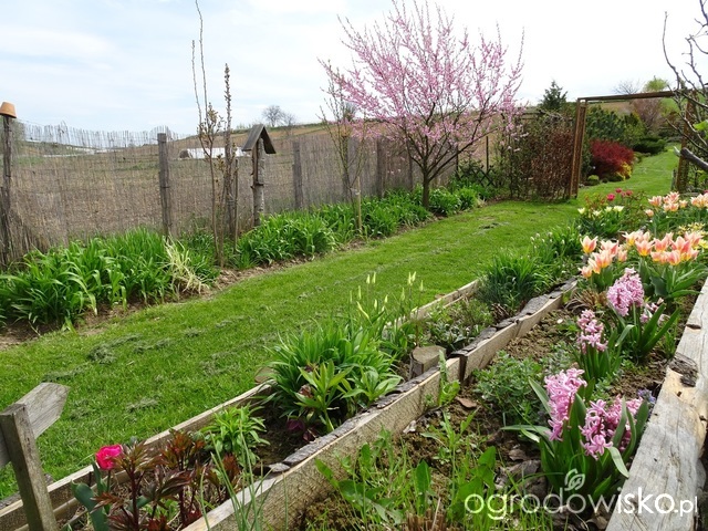 (Drewnianymi plotkami osłonięte są hortensje, siatka czeka na zamontowanie)