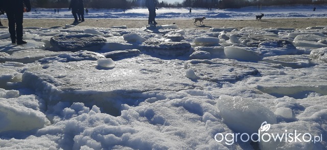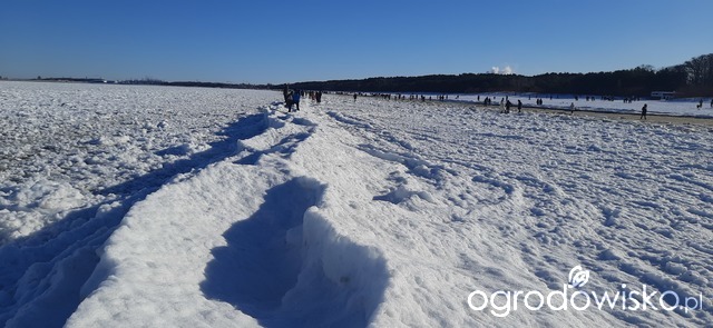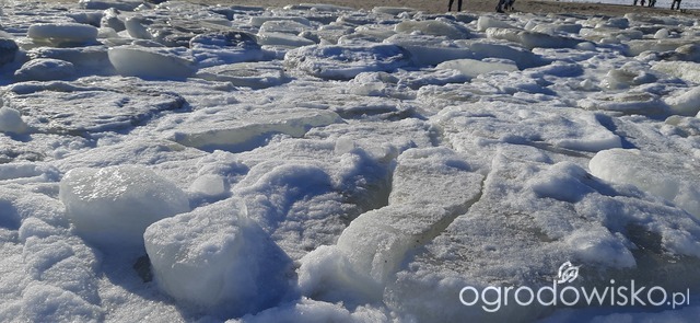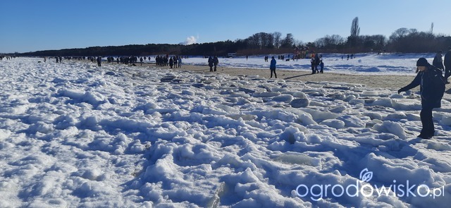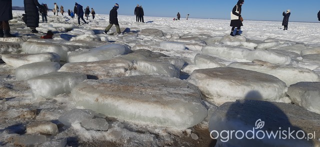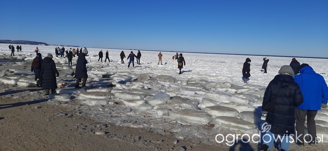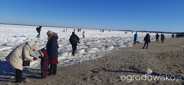 Dzisiejszy cudowny spacer po plaży, morze daleko w głąb zamarznięte, ludzie, my też, chodzą po krach scalonych, spacerowiczów tłumy, nie dało się zrobić zdjęcia bez nich