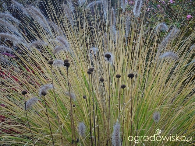 Jesień, zdjęcie twarzą do róży, widać w głębi murek i różę. Po prawej kwadratowa rabata z sosną na środku, bardzo trudna do obsadzenia. Póki co to są tam jałowce płożące i inne zimozielone. Próbuję dosadzać trawy i firletki. Ale proces trudny. Wystawa zachodnia.