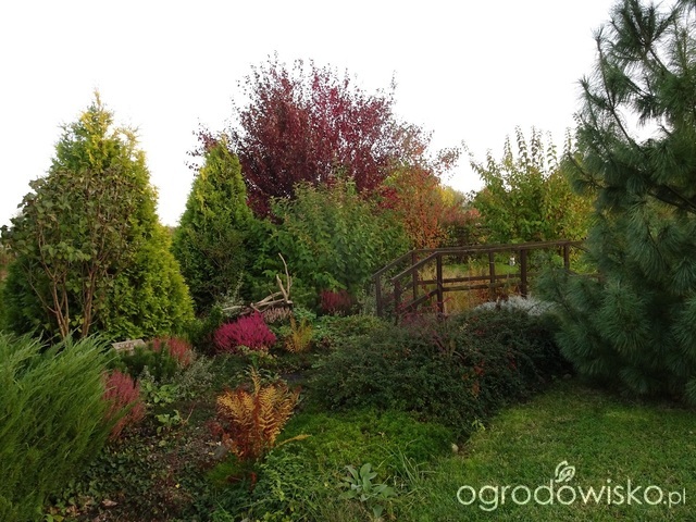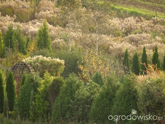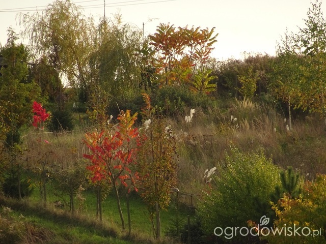 Rabata zachodnia, jak to u mnie, dzieli się na mniejsze rabatki. Tu pod jadalnią, październik z rdestami Blackfield, jedna z najmłodszych rabatek. Zakochałam się w rdestach, mam już kilka odmian.