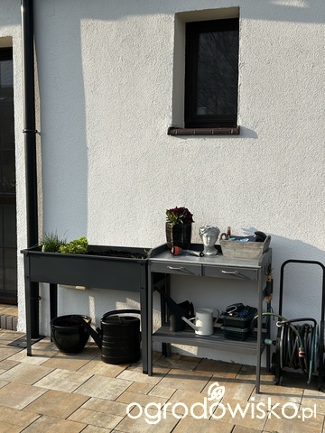 I mój nowy nabytek - donica na nogach z przeznaczeniem na zieleninę. Wsadziłam tam kępę szczypiorku wieloletniego, pietruszkę naciową, dwie cebulki dymki, rukolę. Dosieję kolorowej sałaty. A w maju wsadzę bazylię. Wszystko będzie pod ręką, tuż obok drzwi kuchennych. Przemalowałam też mój stolik ogrodniczy na szaro.