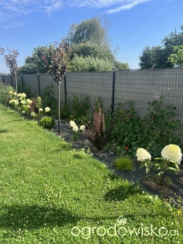 Chciałbym uzyskać efekt nieregularnego żywopłotu, ale też nie za dużo tych krzewów. W węższej części śwuadomie same trawy i hortensje Annabelle.