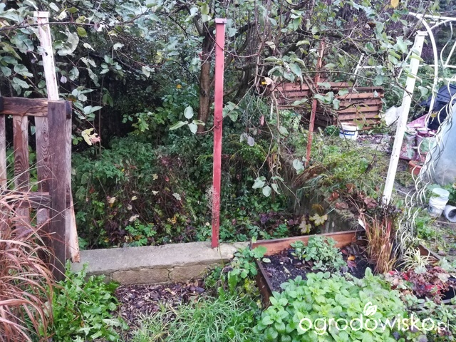 Wykorzystać ciepłe dni jesienią i zimą do wygrabienia zielska. Leszczynę, mimo sentymentów, dobrze byłoby zastąpić czymś innym. Ten wgłębnik ma idealne warunki świetlne i szkoda go na potężny krzaczor. Można tam wykorzystać roślinę miododajną o większych walorach estetycznych.