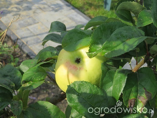Przyznam, że ta jabłoń zaskoczyła mnie bardzo pozytywnie. Nieduże drzewko miało 6 dużych owoców. Ważyłam, każde jabłko miało ponad 400 g.
