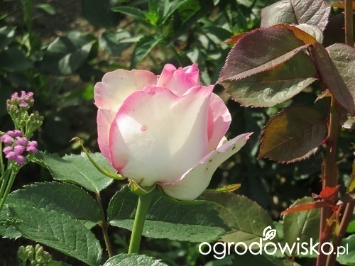 To piękna róża wielkokwiatowa. Kwiat jest duży, biały z dodatkiem różu. Co jest ciekawe, to u mnie nie rozwija się, pozostaje jakby w pąku i kwiat jest bardzo trwały. Bardzo mi się ona podoba.