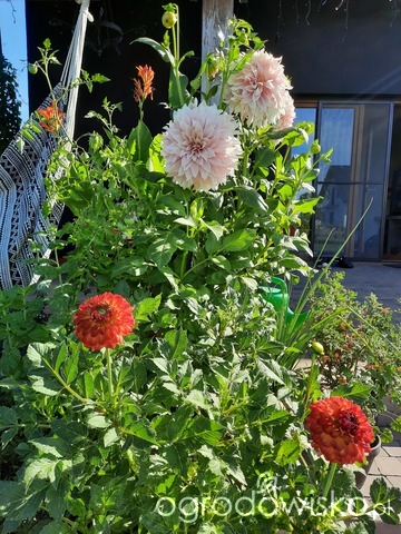 Na dzisiaj mam dla Was moją najbardziej problematyczną dalię. Kameleonową pomyłkę, której do zeszłego roku nie lubiłam, bezskutecznie szukając jej nowego domu. W zeszłym roku trafiła na żółto-ciemną rabatę i nagle zmieniłam o niej zdanie. W tym roku rabata pełni funkcję przechowalnika doniczek wszelakich, postanowiłam więc wsadzić kameleona do donicy i stworzyć kontrowersyjny zestaw z Cafe au Lait. O dziwo w połączeniu tych na pozór gryzących się barw z pomocą przyszła mi kolejna pomyłka - tym razem kanna