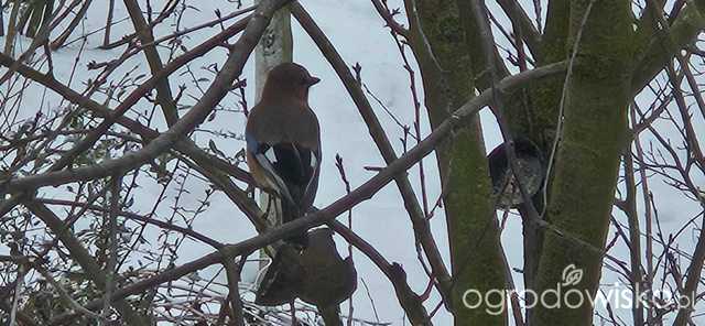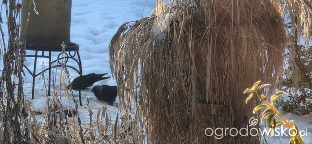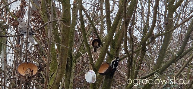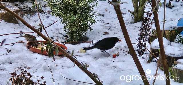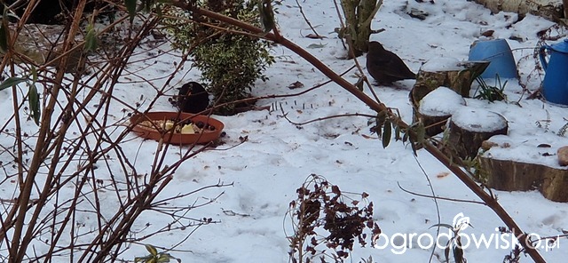 Ja daje moim jabłko, gruszkę i aronię, mam mrożoną. Czasami banana ale go nie zawsze zjadają, dlatego przestałam. Jabłko i gruszkę kroję na taką bardzo grubą kostkę, bo jak dawałam większe to jeden się częstował i odganiał pozostałe. Zauważyłam, że czasami poskubią sobie też mieszankę ziaren, ze słonecznikiem i orzechami. Na podstawek daje im te owoce i garstkę ziaren, takiej mieszanki. Jak kosy tego nie zjedzą to inne ptaki z tego korzystają. Bo np. sierpówki rzadko kiedy zaglądają do karmika i zjadają to co na ziemi. Rano do jednego podstawka, jak jest jeszcze spokój, zaglada jeden rudzik, on lubi spokój. Jak przylatuje stadko wróbli, rudzik się chowa. Daję im zawsze rano a około 11-12 jest wszystko zjedzone, wtedy dostają trochę mniejszą dokładkę Jedynie kokosy z tłuszczem i ziarnami wiszą cały czas.