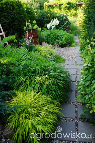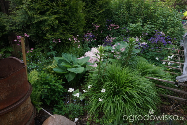 ) ale, jak to u mnie bywa, problemy działkowe często rozwiązują się same, i tak górę nad wszystkim wzięły hakonechloa, wiosną górują samosiejki orlików i niezapominajki a potem wszechobecna werbena. Najcudowniejsze w tej części ogrodu jest to, że w ogóle nic tu nie trzeba robić. Rośnie sobie wszystko samo, nic nie pielę, w upały zraszacz wstawiłam w tym roku 3 razy (nie mam tu linii kroplującej)