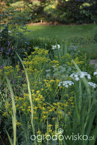Krwawnik wiązówkowaty, dziurawiec, groszek pachnący i piołuny a z tyłu kwitnący po raz 2. lubczyk. W tym roku nie cięłam obwódek bukszpanowych w zielniku. Przechodzą one reanimację octanem wapnia i gnojówkami.