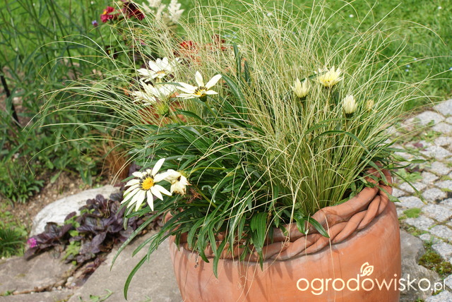 Kompozycje donicowe spotkały się ze sobą: łączka letnia i rabatka jesienna w terakotowych donicach:
