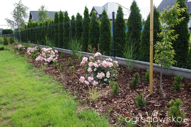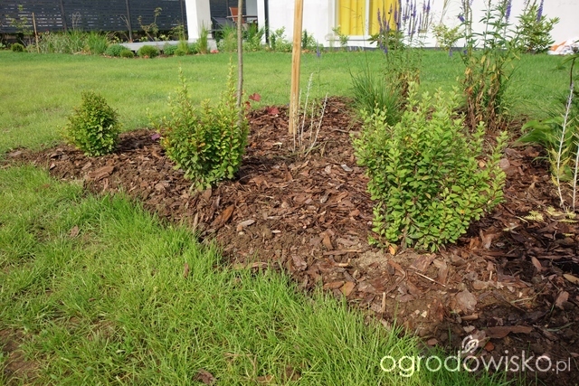 Między tujami a krawędzią trawnika wykrojona została rabata. Wystawa północno-wschodnia narzucała wybór roślin znoszących cień i półcień.