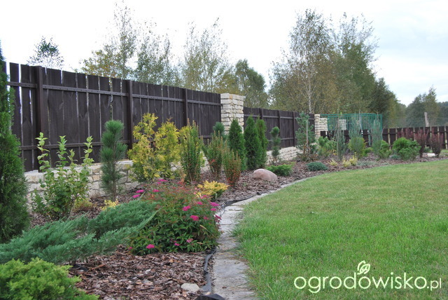 Pięknie, a tutaj dla odmiany za trzema kulkami w prawo daj śliwę wiśniową na kiju, pienne drzewko purpurowe. Albo cis zielony kula na pniu.