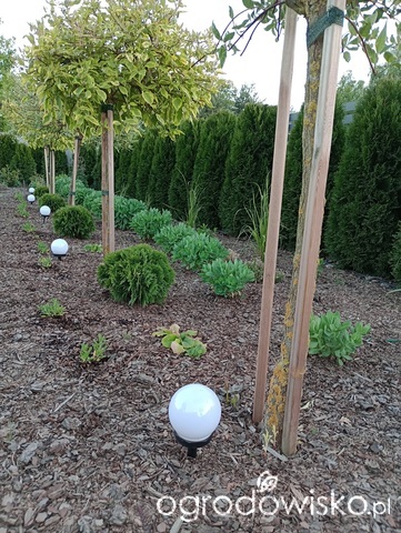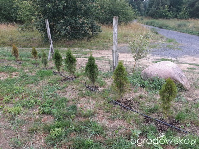 Tu już widać że zdarcie darni, gruba ściółka , nawóz i woda są niezbędne. W ciągu 4 m-cy tujki się upasły i nabrały koloru.
