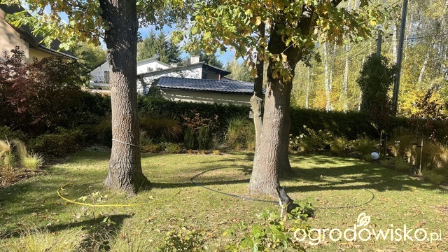 Koło - jak wcześniej - obejmujące dwa dęby i małe kółko przy trzecim. Niby żadna różnica, a nie ma tu dysharmonii . Pomiędzy kołami trawiasta ścieżka szerokości kosiarki.