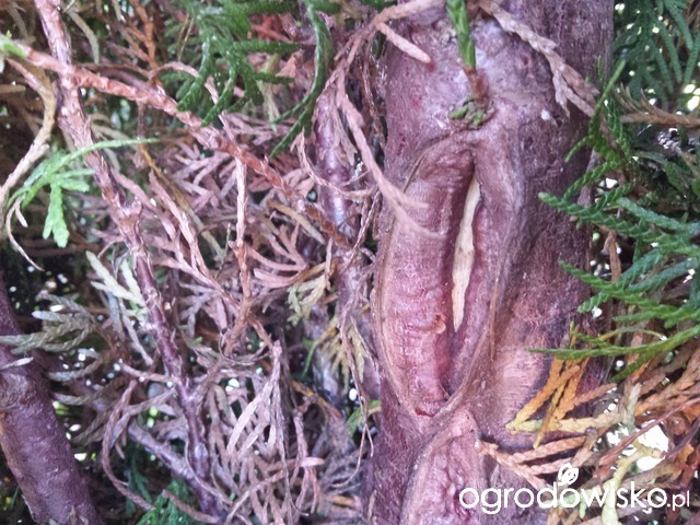 Jedyne co dostrzegłam to dużą ilość pęknięć na pniu, inne tuje tego nie mają tylko ta jedna. wysmarowałam wszystkie pęknięcia sztuczną korą ale to chyba niewiele dało