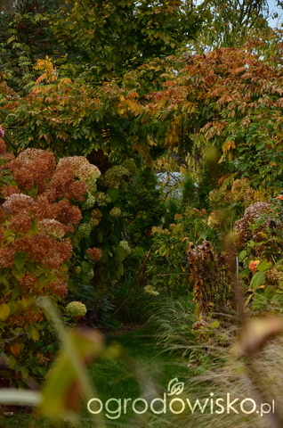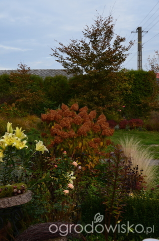 Często robię zdjęcia na ten widok z bukszpanami. Te kulki obok stożka miały wylecieć. Kupiłam już piwonie i miały tam mieć miejscówkę. No i się rozmyśliłam, bo to jednak fajny kawałek ogrodu. Piwonie wiosną posadziłam do dużych donic, i dalej są w tych donicach. Pniaczki bardzo lubię, bo to naturalne plastry dębu są, a ja lubię dekoracje z naturalnych składników.