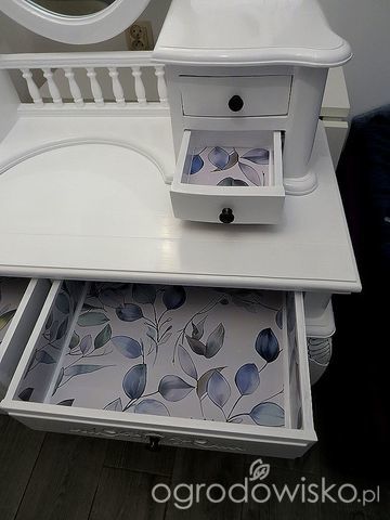 Nie tak dawno skończyłam przerabianie toaletki na prezent, z ciemnej na biel, bo obdarowana wolała jasną, ale się powstrzymywałam przed nadmiernym ozdabianiem z decoupage, jak to mam w nieposkromionym obłędzie i tylko przecierki zrobiłam, żeby uwidocznić rzeźbienia szufladki wykleiłam tapetą samoprzylepną. Jeszcze zrobiłam niewielki rzucik przy uchwytach małych szufladeczek (ale bez zdj) Wyjedzie niedługo do W-wy
