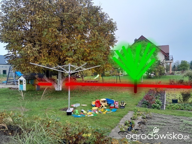 No to patrząc na te zdjęcia i plan z góry, u brata dałabym magnolię, którą chcesz dać za orzechem, a po Twojej stronie wiśnię 1 szt. Jeśli od placu zabaw do warzywniaka jest 12m, to biorąc pod uwagę rozmiary orzecha, na kolejne dwa drzewa i jeszcze magnolię może być ciasnawo. Szkoda chyba też magnolie za orzechem chować.