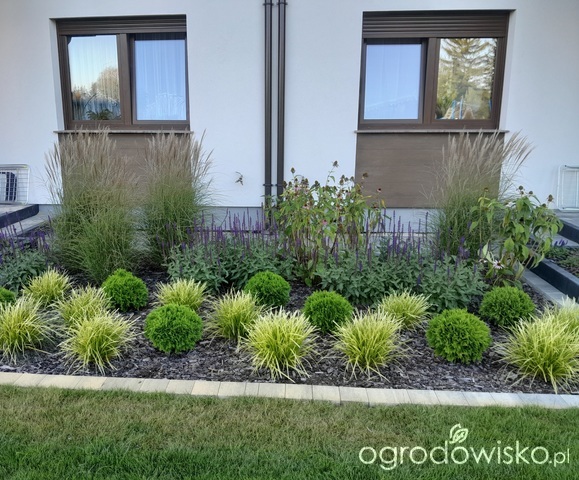 A wczorajszy pomysł przy tarasach - 1 hortensja w środku, między miskantami. Albo krzaczasta albo na pniu (taką mam właśnie).