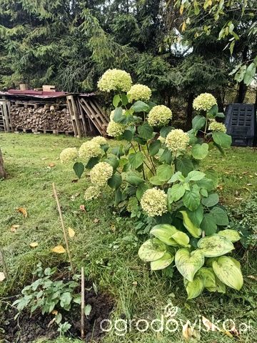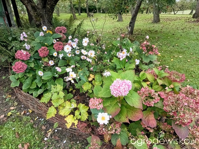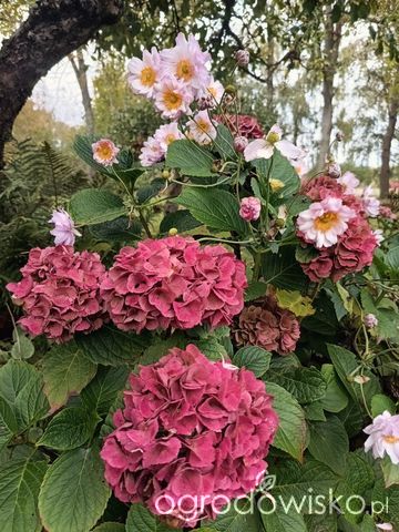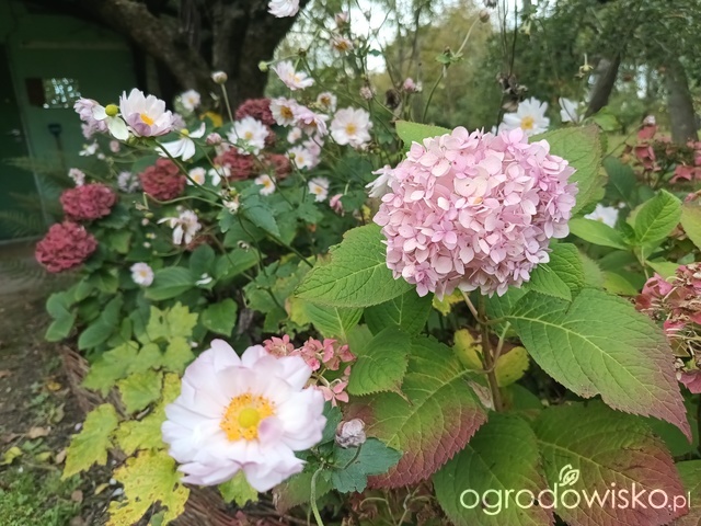 Pięknie prezentują się hortensje i klon utopiony w Hakonechloe
