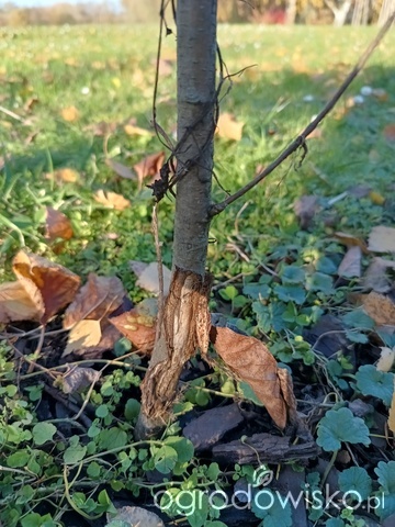 Co byście zrobiły z tym pniem? Czy można w ogóle jeszcze coś zrobić, aby ratować to drzewko? To grujecznik japoński, sadzony wiosną. A uszkodzenie - prawdopodobnie robota "pomocnika" przy koszeniu stryja. Normalnie nóż się w kieszeni otwiera...