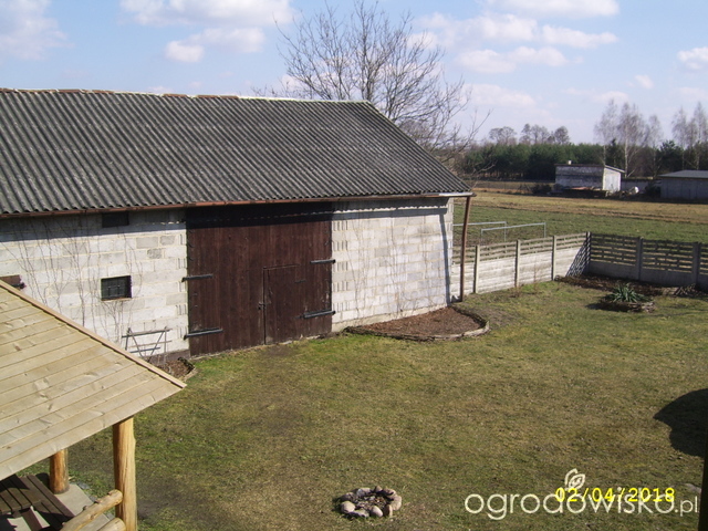 Fantazyjny placek z betonu, niesławny drąg i brzoskwinia (nie powiem, owoce miała pyszne, ale skazałam ją na eksmisję do sadu). Plastikową suszarkę na ubrania zamaskowaliśmy jutowymi workami, żeby tak nie kłuła w oczy- druciarstwo pełną gębą hahaha