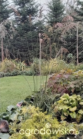 Też lubię tę rabatę liliowcową i ciągle ją ulepszam jedna z trzech molinii zmieniła lekko miejscówkę, poszła na obrzeże. Na tyłach były Red Barony,które świetnie jesienią przyciągały uwagę na tą rabatę, ale ich ekspansywność przerażała, więc zamieniłam je na proso Shenandoah od Moni i dodałam też ciemnych Twoich rozchodników, bo sobie je już pomnożyłam. Efekty za rok nie zdążyłam w tym sezonie pociągnąć obwódki z bergenii