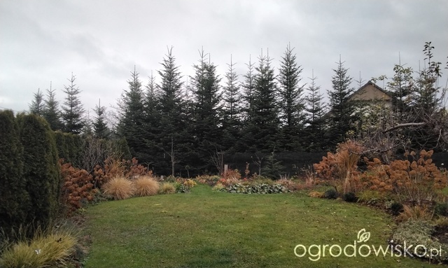 Od swojej strony próbuję zielone tło ubarwić liściastymi akcentami, ale słabo mi idzie. Coraz częściej myślę, że niepotrzebnie upierałam się na buki, one u mnie kiepsko rosną. Ale już wrosły w ziemię to muszą zostać. Zdecydowanie lepszy byłby dąb błotny, więc dokupię tu i zajmie miejsce jednego wykopanego rodka.