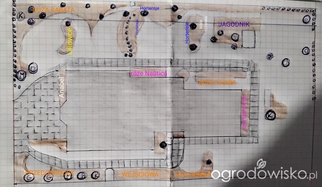 Narysowałam nowy plan sytuacyjny bo stary rysunek jest nieaktualny. Niestety płaski rysunek daje tylko ogólny pogląd, bo nie oddaje przestrzeni jaką tworzą rośliny.