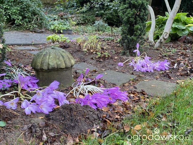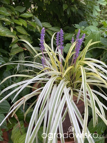 Chyba powinnam już zabrać pod dach z deszczu, bo nie wybarwią się liście. Przebarwiają się spektakularnie oliwkowo- miedziano. Podobno znosi temp. do -18, ale jeszcze nie zaryzykuję posadzenia do gruntu. Po prawej liriope szafirkowata w odmianie