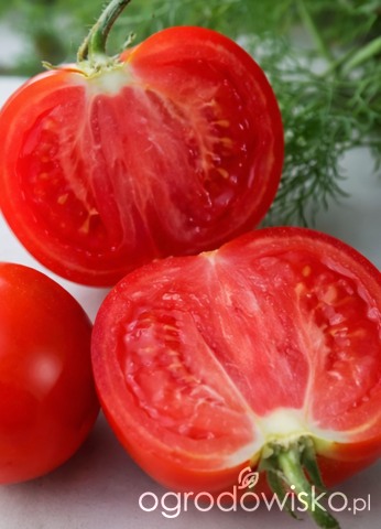 Owoce są kuliste, czerwone, zwykle w granicach 100–150 gramów, dobre do codziennego jedzenia. Takie, jakie chce się mieć na pierwszą letnią kanapkę. Akurat na jednorazowe krojenie bez walki z gigantem na desce.